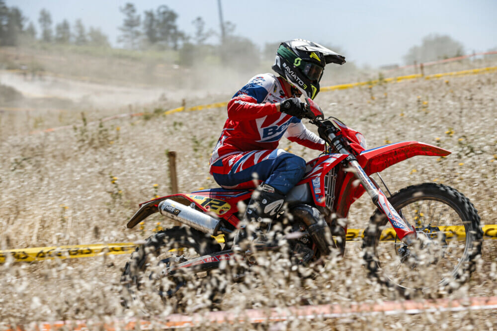 All smiles after his first EnduroGP victory of the season on Saturday, Nathan Watson wasted no time in returning to the top step of the podium by winning again on Sunday. Clearly favoring the hard and dry Portuguese terrain, the Honda rider hit his stride late on lap one by topping the opening Acerbis Cross Test. Fastest in the following Just1 Enduro Test, he closed the gap to early leader Steve Holcombe (Beta).