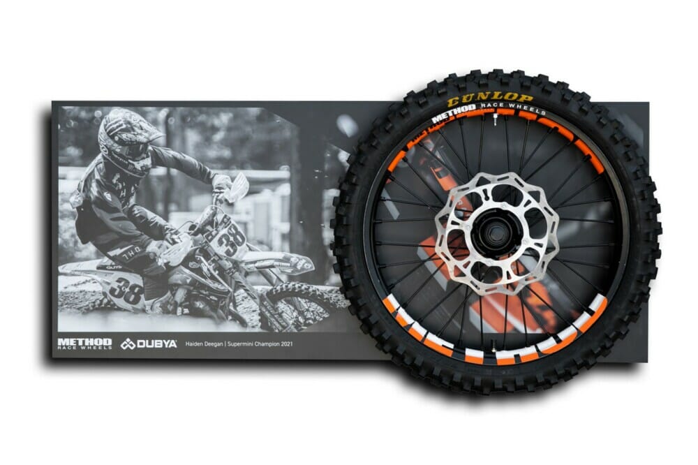 This Haiden Deegan x Method Race Wheels® “R.I.M. Proto Project” plaque display is a true work of art. The handcrafted real wood display features a sublimated iconic Haidan Deegan racing poster and custom mounting that attaches the Method Race Wheels® rear wheel with a new Dunlop tire to complete the display. This is your chance to own a piece of history and all for an amazing cause. To place your bids on MXLocker.com click here.