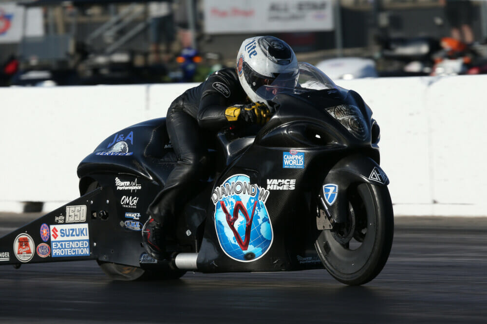 In terms of performance, Gladstone’s win in Topeka was even more dominant than his initial Sonoma victory. In qualifying, Gladstone had the quickest bike in all three qualifying sessions including a 6.831 that was good for the top spot. Vance & Hines Suzuki’s Angelle Sampey was second quickest, but her 6.882 best was five-hundredths slower than Gladstone, and that’s an eternity in NHRA drag racing.