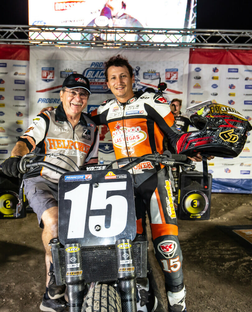 Despite still riding at less than 100%, Mikey Rush (No. 15 Helipower Racing/Las Vegas Harley-Davidson XG750R) achieved a huge milestone in his comeback following last year’s season-ending injury by taking his first-career Mission Production Twins presented by Vance & Hines victory.