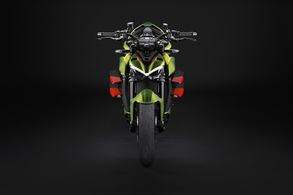The aluminum Front Frame uses the engine as a stressed element. The suspension is the Öhlins Smart EC 2.0 semi-active units, while the Brembo braking system relies on Stylema calipers and 330 mm discs. Based on carbon biplane wings integrated into the tank side covers, the aerodynamic package stabilizes the bike at high speeds without compromising agility and handling. The curb weight is 435.5 lbs.[GA1]