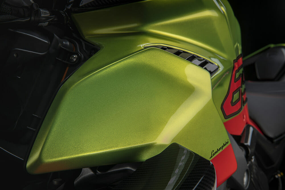 The model’s name and the bike’s serial number are shown on a metal plate inserted in the central tank cover. The number is also machined from solid aluminum, and appears on the TFT dashboard during ignition, together with a celebratory animation showing the Ducati and Lamborghini badges and the silhouette of the model.