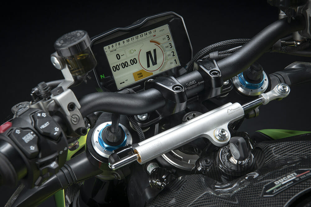 630 examples of the Ducati Streetfighter Lamborghini will be made in Verde Citrea and Arancio Dac livery, one of the specific color combinations of the Huracán STO. The Brembo wings and brake calipers are also colored in Arancio Dac, the latter with a contrasting black logo. The Öhlins stays and fork legs are also black.