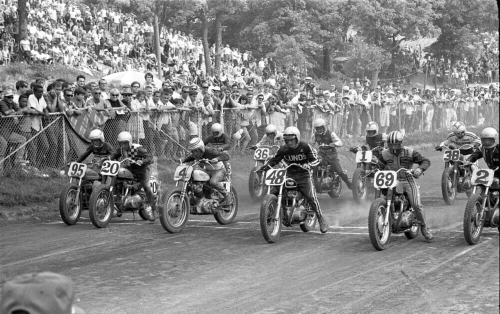 In maybe one of the oldest Throwback Thursday’s we’ve ever posted, we travel back more than a half a century, 54 years to be exact, to 1968 and that summer’s Peoria TT National This photo shows the start of the 20-lap AMA Grand National. In front of a crowd estimated to be 15 to 20,000 strong you see an incredible field of riders that includes (from left to right) Fred Nix (No. 95), Gene Romero (No. 20), Bart Markel (No. 4), Jim Corpe (No. 48), Sonny Burres (No. 69) and Dick Mann (No. 2) starting from the front row. Visible on the second row are Cal Rayborn, Ben Breeding (No. 36), Skip Van Leeuwen, Gary Nixon (No. 1) and Chuck Palmgren (No. 38). Mann on his BSA took the early lead, but when his bike developed a misfire, it was Harley-Davidson star Bart Markel coming up to take over the lead. The leading duo ran close for much of the national, but it was Markel holding on for victory over Mann. Sonny Burres took third on a Triumph.