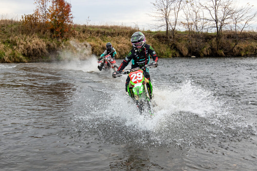 A shotgun blast just after 10:00 a.m. sent the first row out on their adventure. After flying across a giant expanse of freshly-harvested corn fields, the racers dropped into the woods for a challenging combination of everything from tight single track, creek crossings and fields to an obstacle affectionately referred to simply as “the log.” This log has been a hang-up for many seasoned veteran racers, and the Pro group would cross it three times. Just after 3:00 p.m., the GasGas 350 ridden by Jhak Walker wrapped up the final loop through the motocross track to collect the overall victory.