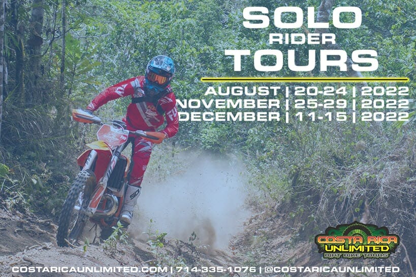 Costa Rica Unlimited (CRU) Solo Tours brings ‘solo’ riders together for all-inclusive tours. Come by yourself, or receive a deep discount with a group. CRU provides the lead and chase guides and can accommodate a variety of skill levels.