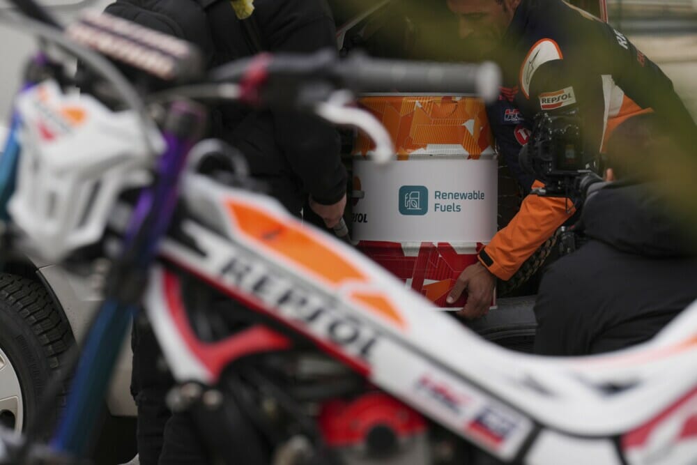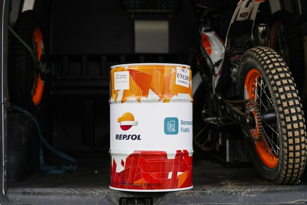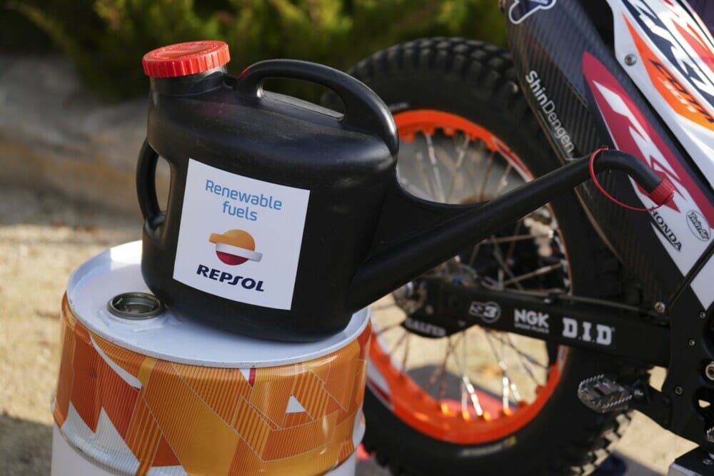 The Repsol Honda trial team have carried out a first test with renewable fuel. Toni Bou and Gabriel Marcelli work with researchers from the Repsol innovation center to produce new renewable fuels with the aim of reducing emissions from their motorcycles by using these fuels, which come from organic waste and emit up to 90% less net CO2 emissions than conventional fuels. The feedback from the Repsol Honda Trial team riders is key to the development of this fuel, designed to maintain the same performance as traditional fuel and significantly reduce net CO2 emissions.