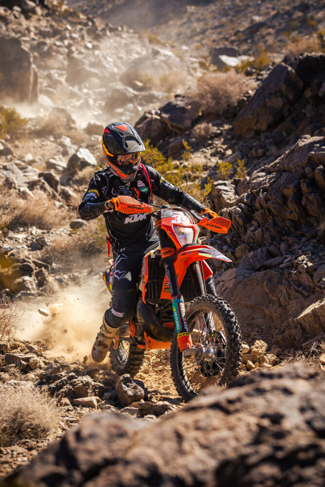 Race 1 determine the top 75 riders who would qualify for Sunday’s main event. Saturday’s race kicked off with a land-rush start up a rocky hill, creating instant chaos for the multiple rows that were leaving 30 seconds apart. The pace of the front pack, led by Trystan Hart, of the FMF KTM Factory Racing Team, quickly separated from the rest of the field as they rode around the mountain range. Climbing up some very steep switchbacks and then returning down slick rock slabs seemed to be the most challenging sections of this course. Hart kept a 2–3-minute lead over FactoryONE Sherco’s Cody Webb for most of the race, but towards the end, the 2022 USHE Champion, Hart, pulled away and finished first with four minutes to spare over Riordan.