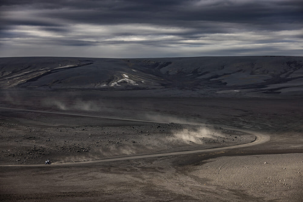 The winds are incredible. They have stopped us dead in our tracks. We are traversing the black sand singletrack that leads up the side of the Hekla Volcano, one of the most active in a land that can count 130 volcanoes within its borders.