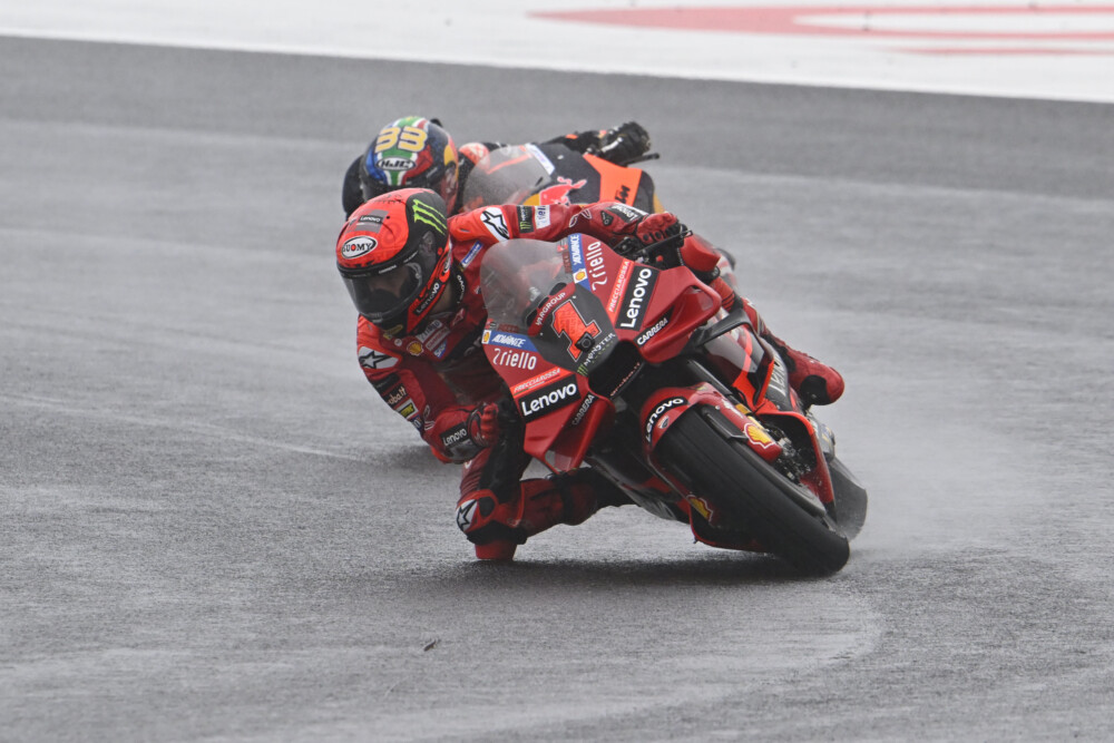 The threat of a flag-to-flag race loomed but more rain fell after the Moto2™ race as the premier class revved up for a 25-lap fully wet encounter. After an atmospheric national anthem through the rain, Bezzecchi grabbed the holeshot from polesitter Alex Marquez, with Bagnaia third and Franco Morbidelli (Monster Energy Yamaha MotoGP™) slotting into P4. Maverick Viñales (Aprilia Racing) didn’t get away well, and Tissot Sprint hero Brad Binder (Red Bull KTM Factory Racing) crashed at Turn 5 after contact with the Aprilia rider too.