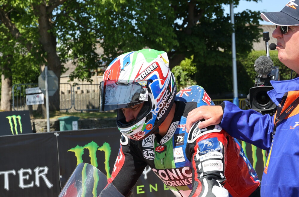 By now it’s 12:30 pm and with the flag drop set for 2:30 pm, the administrative race is on. Paperwork signed with head office, transponders and GPS units fitted, new Metzeler tires on, and the bike into technical inspection, the Kibosh crew springs into action for a rider they’d only just met an hour before and now they trust with their racebike. It dawns on me there’s probably no racing paddock in the world where this could happen except the Isle of Man. It is heartwarming to experience.