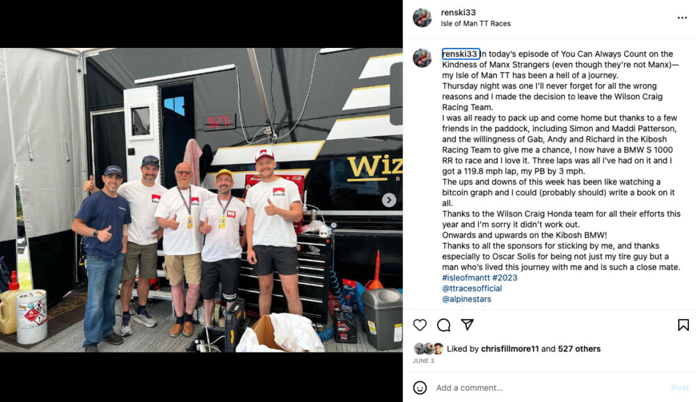 Simon and Maddi Patterson deserve a special mention. Without their help, I’d never have found another team to ride for and my TT would have been done after four nights.