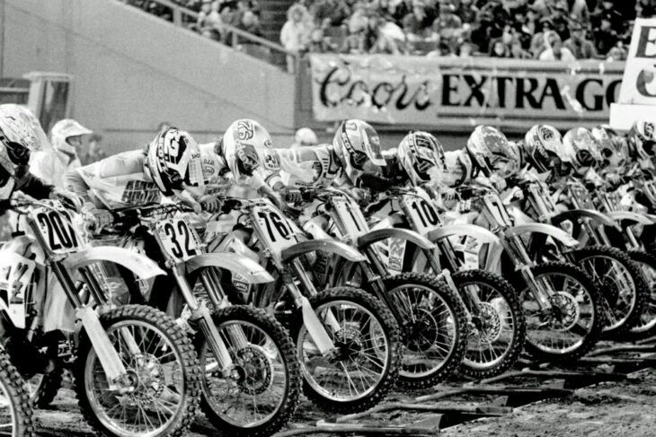 In this week’s Throwback we wind back the clock 33 years to February of 1990 and the Atlanta Supercross held in the outdoor venue Fulton County Stadium. Riders and 43,100 fans shivered in temperatures that by the evening program had dropped into the low 30s. This photo shows the start of the first Heat race of the night. From left to right are Kurtis Barron (No. 207), Dennis Hawthorne (No. 32), Jason Buttle (No. 76), Jeff Stanton (No. 1), Mike LaRocco (No. 10), Doug Dubach (No. 7), Rick Johnson (No. 13), John Rickel (No. 595) and others. Johnson went on to win the Heat over Stanton and LaRocco. Later that night Jeff Ward took the victory by passing Guy Cooper on the final lap.