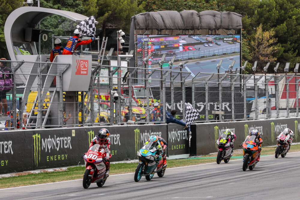 Moto3™ delivered an absolute barnstormer in Barcelona as there was action everywhere you looked on the final lap, and plenty of drama too. David Alonso (Gaviota GASGAS Aspar Team) took the spoils by just 0.076s after an incredible final corner overtake saw three riders squeezed up onto the apex, with Jaume Masia (Leopard Racing) taking second but bringing home 20 crucial points as Championship leader Daniel Holgado (Red Bull KTM Tech3) crashed out earlier on the last lap.