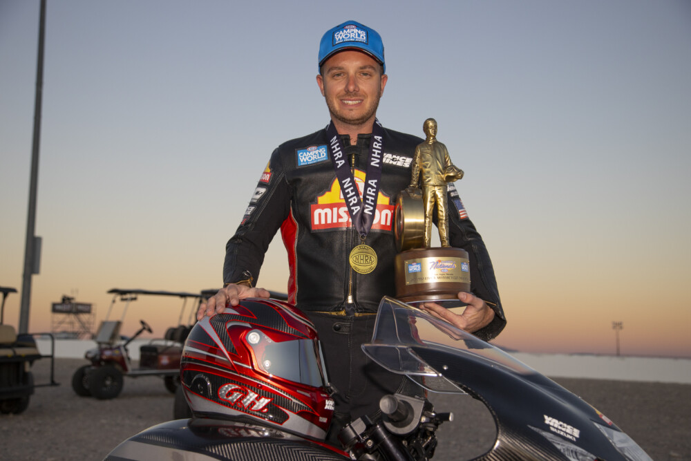 Herrera defeated teammate Eddie Krawiec in the final round for the fourth time this season, claiming the NHRA Nevada Nationals title at The Strip at Las Vegas Motor Speedway, October 27-29. Herrera rode to a track record of 6.755 elapsed time in the final round. With his 10th win in 14 events, Herrera has tied former Vance & Hines rider Matt Hines for most wins in a season.