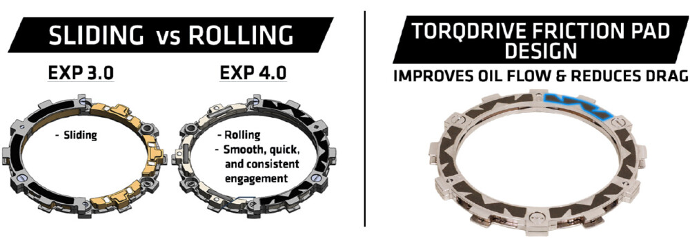 EXP 4.0 offers riders more direct power delivery to the rear wheel, unmatched durability even under high temperatures, and an enhanced lever feel for more connected and precise control. Its highly responsive engagement is due to an improved base and wedge design with pins and bearings that enable rolling instead of sliding to expand the disk, reducing resistance in engagement.