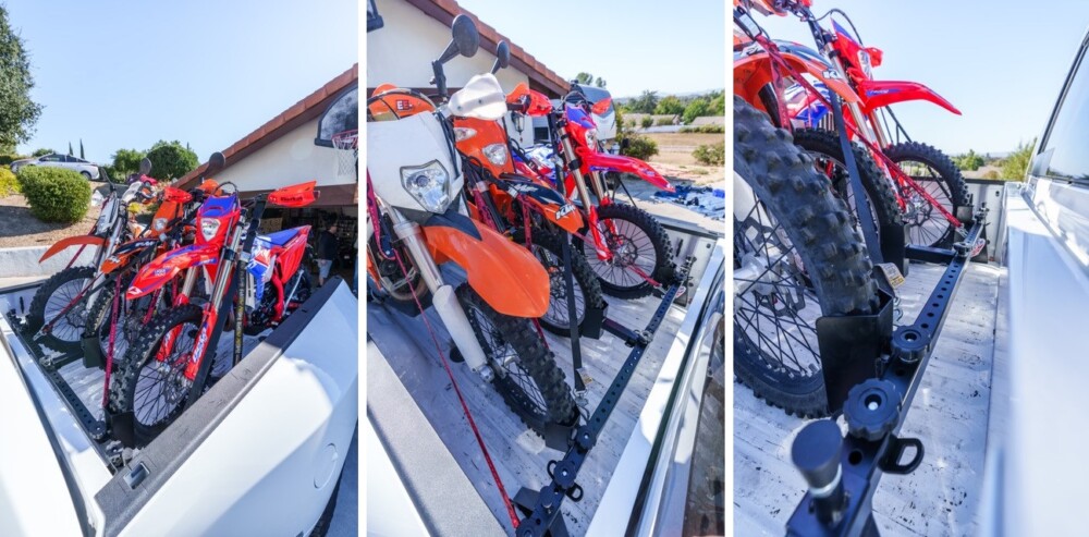 No drilling is required for installation and the system secures to the factory-installed d-rings using two J-hooks. The rack system is made from sturdy high-grade alloy steel with a long-lasting powder-coated finish. The systems can be easily removed and they fit underneath a closed bed cover. Transport systems are available in a wide variety of configurations for securing dirt bikes, sport bikes, cruisers or any other two-wheeled vehicle.