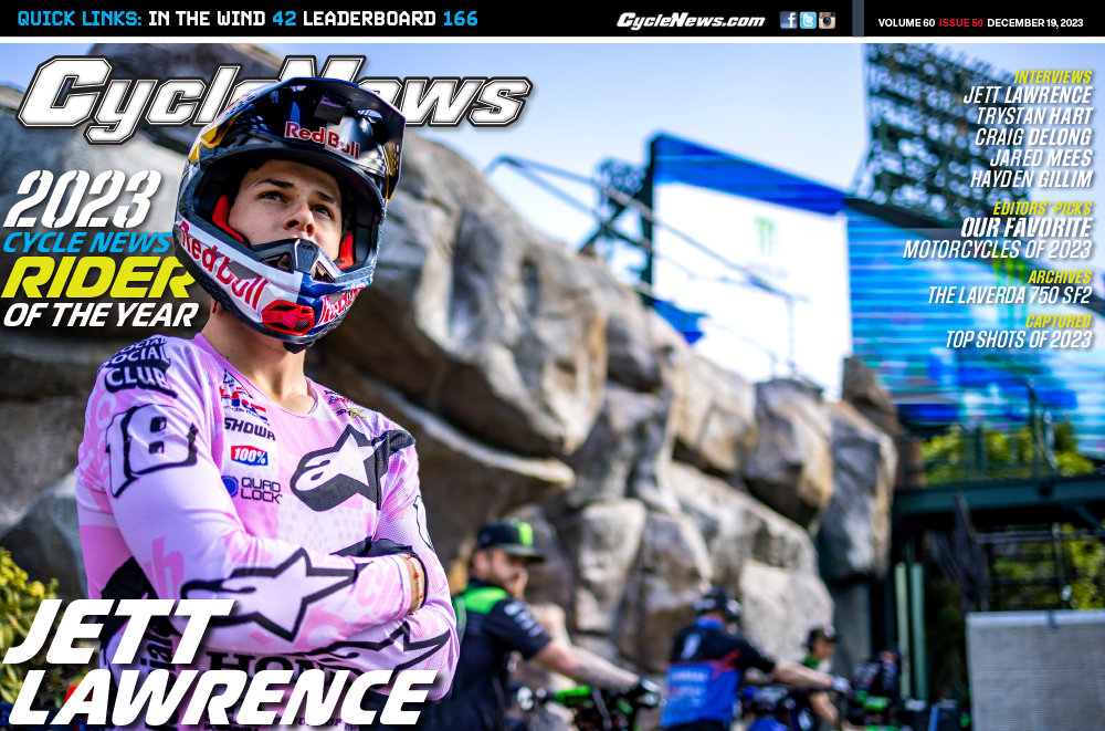 To say that Jett Lawrence had a good season racing dirt bikes would be the understatement of the year. Even great would not do it justice. Phenomenal, or even mind-blowing, might be a little more accurate. Still. After achieving every goal that he and his Honda HRC Team set out to do in the U.S., it should come as no surprise that Jett Lawrence is our 2023 Cycle News Rider of the Year.