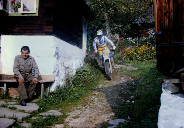 In this week’s Throwback we dial back the clock 41 years to 1982 and look back at a scene from that year’s International Six Day Enduro (ISDE) in Považská Bystrica, Czechoslovakia. Team USA’s World Trophy Team finished runner up, the best finish to that point for the Americans in the prestigious international competition. This photo shows some of the fascinating routes the ISDE followed in that year’s competition. This is Terry Cunningham, who would go on to win the AMA National Enduro Championship that same season, riding his Husqvarna down a cobblestone path through the middle of a small Czechoslovakian village, while a villager sits in front of his home enjoying the close-up view.
