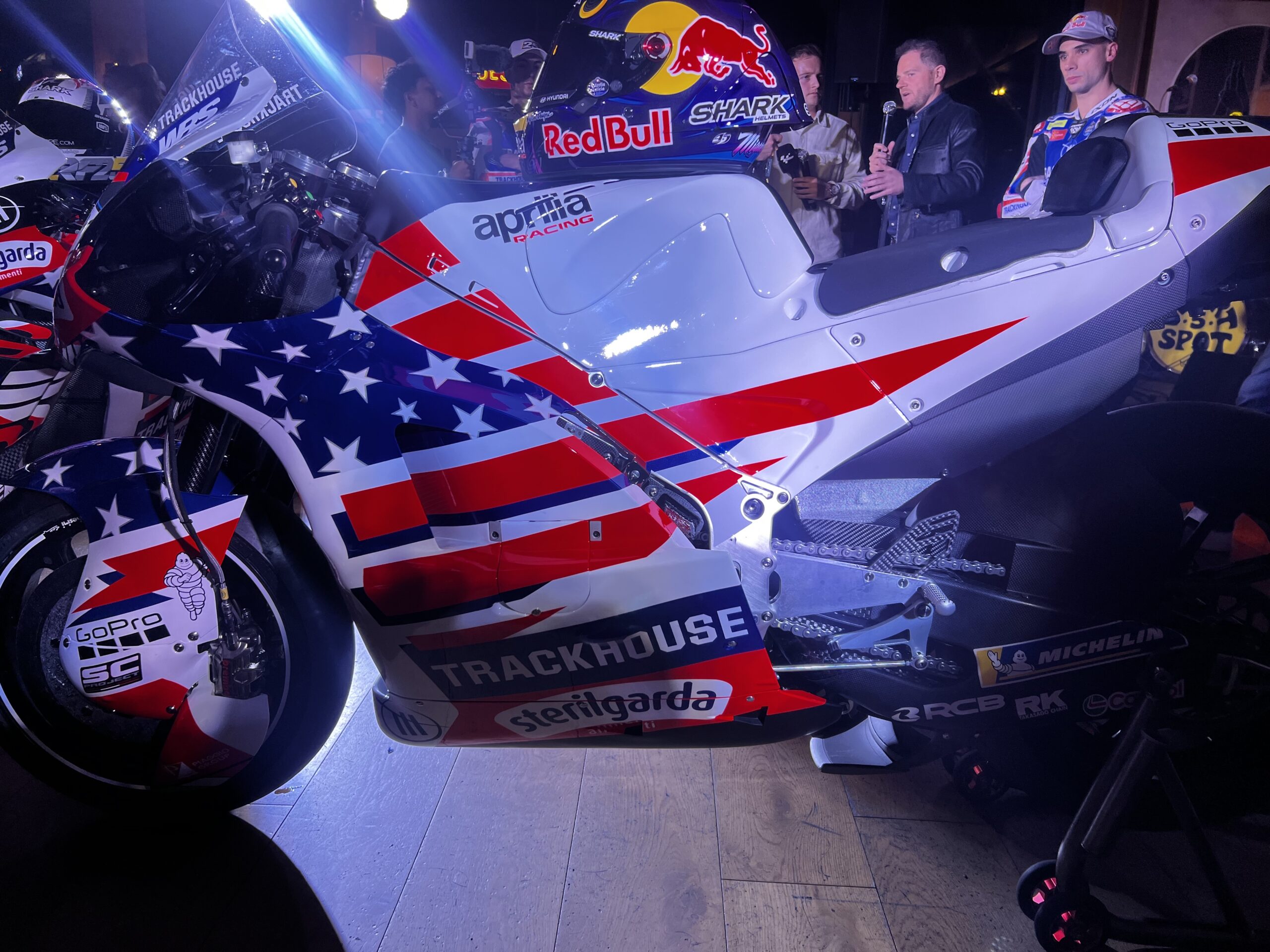 “This launch is an incredible moment,” Marks said. “It’s the combination of an incredible amount of work that everybody at Trackhouse, MotoGP and Aprilia have put together in a very short period of time to make a little bit of magic happen. That’s basically in the space of two or three months, we set up a MotoGP team, ready to compete and to be able to do something great on the racetrack. We’ve got a group of people that are all very, very talented and passionate about the season ahead of us. It’s also special, because we are an American team. We are a global brand, but an American company and to be able to celebrate the formation of this team and debut these incredible bikes in an iconic American city like Hollywood is truly a special, special thing. I look forward to the season.
