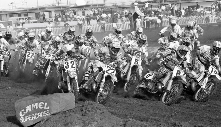 In this week’s Throwback we dial back the clock 30 years to the 1994 Daytona Supercross. This photo shows the start of the main event with riders funneling through a turn. That’s Michael Craig (No. 19) in a good position on the inside line. Doug Henry (No. 8) is also in an excellent position up front, as is Ryan Hughes (No. 22). Doug Dubach (No. 32) appears to be hung out to dry on the outside line pushing him to the very edge of the track. You can also clearly see Jeff Stanton (No. 5), Denny Stephenson (No. 27) and Mike Healy (No. 29) in the Donn Maeda photo. Team Kawasaki’s Mike Kiedrowski emerged to score his second straight Daytona Supercross victory. The next year the “MX Kied” would make it three in a row at the famous race.