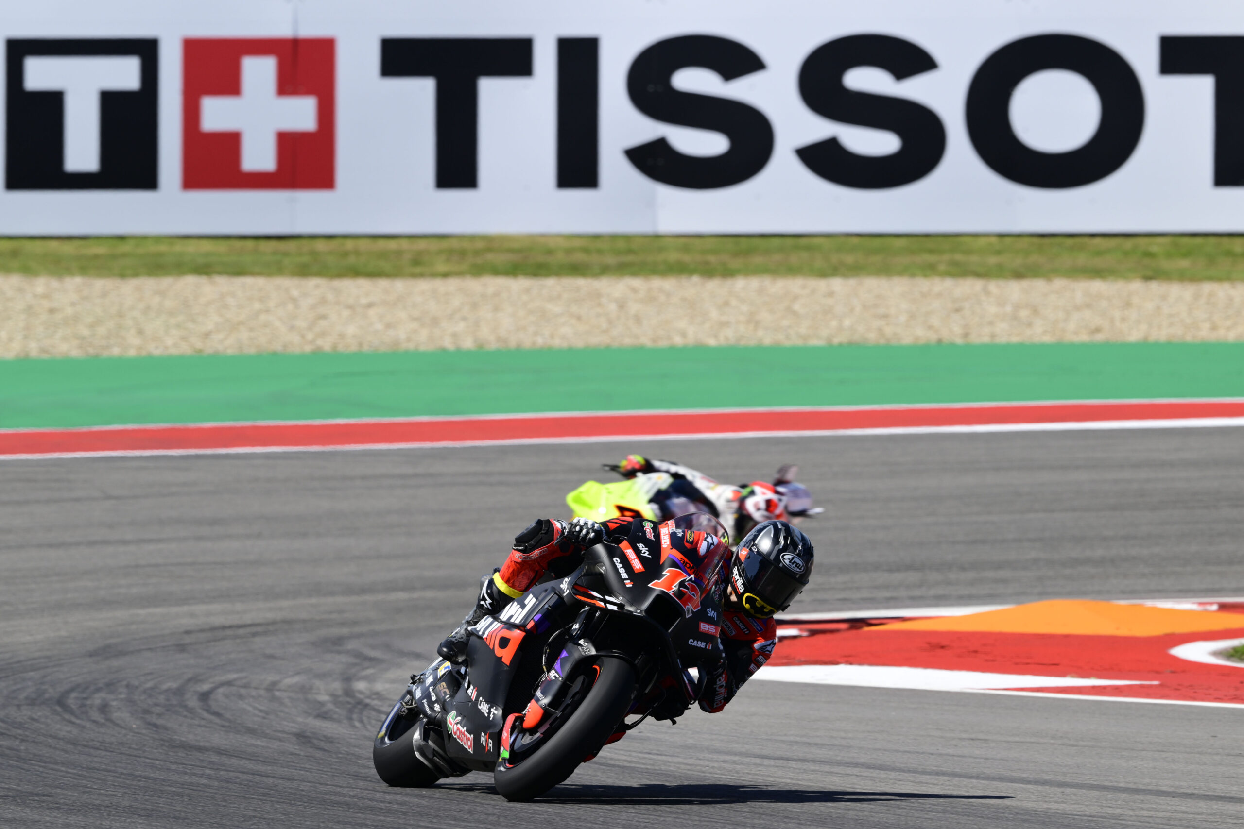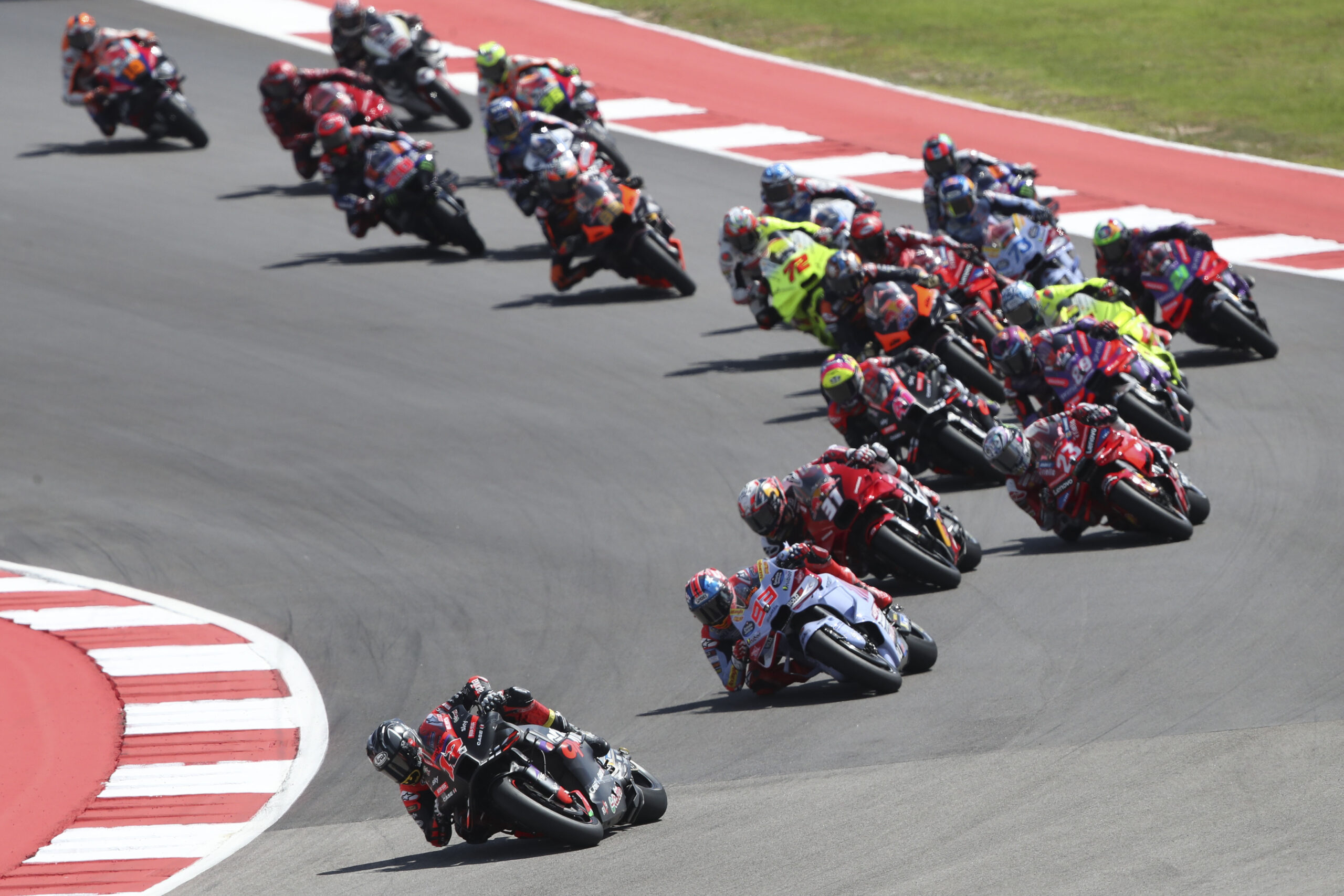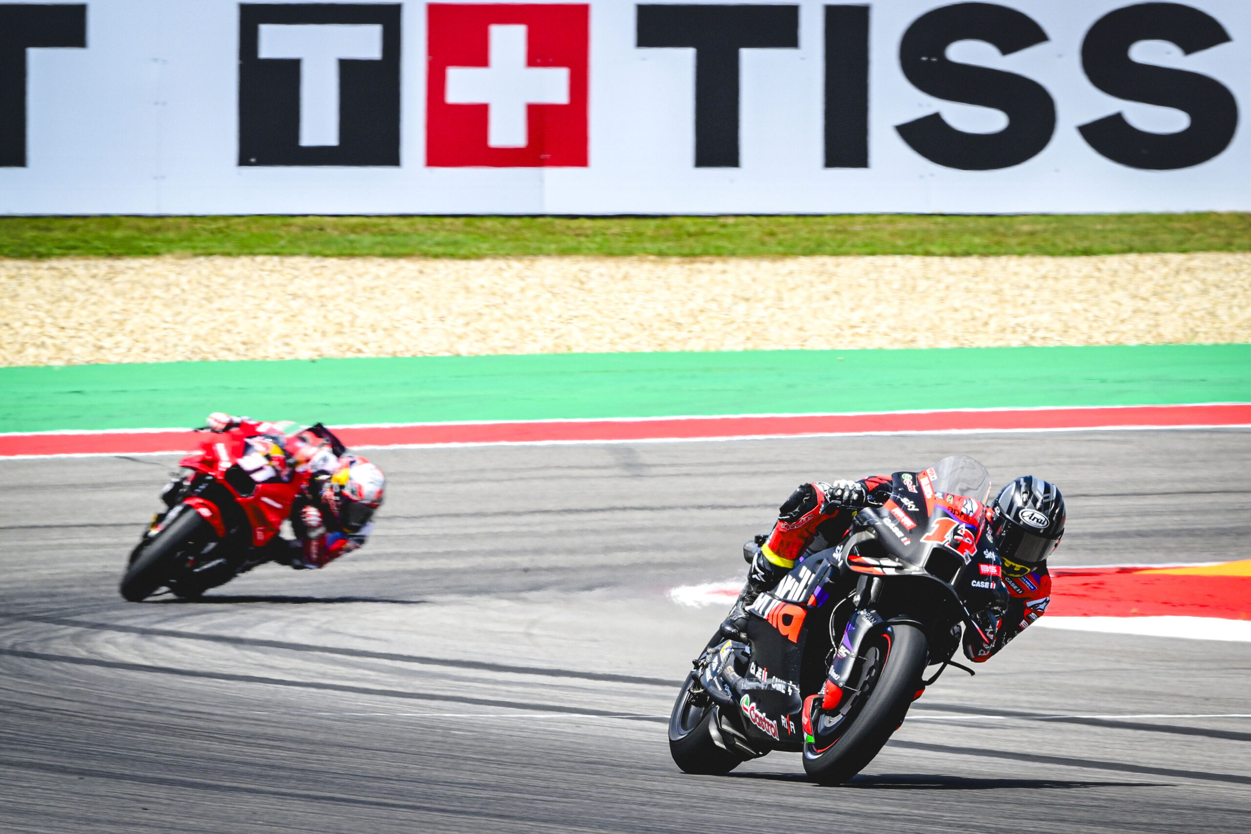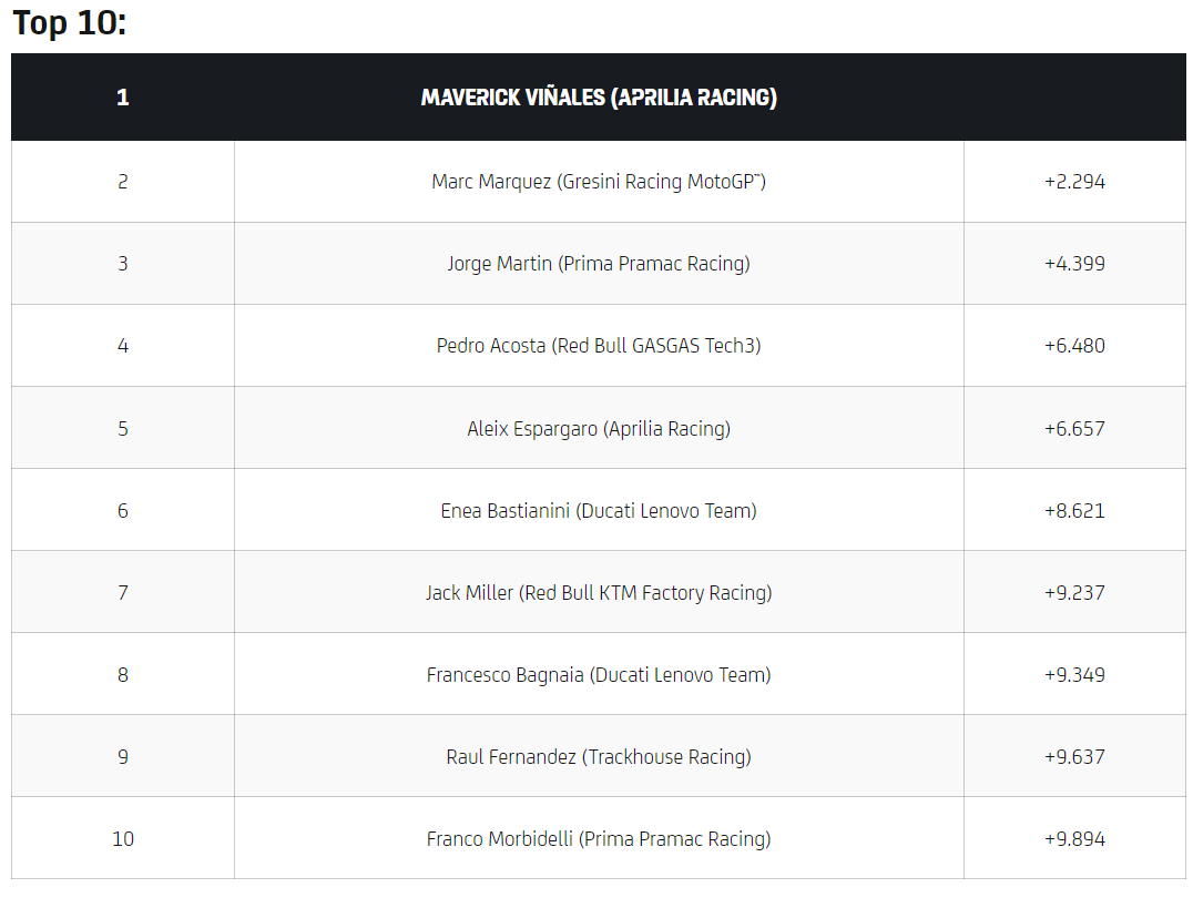 Maverick Viñales (Aprilia Racing) dominated the Tissot Sprint, crossing the line to win a second consecutive Sprint. The Spaniard added 12 more Championship points, finishing the Sprint ahead of Marc Marquez (Gresini Racing MotoGP™), who defended perfectly at the Circuit Of The Americas. Jorge Martin (Prima Pramac Racing) fought through the field, battling from sixth on the grid to finish in a brave third place.