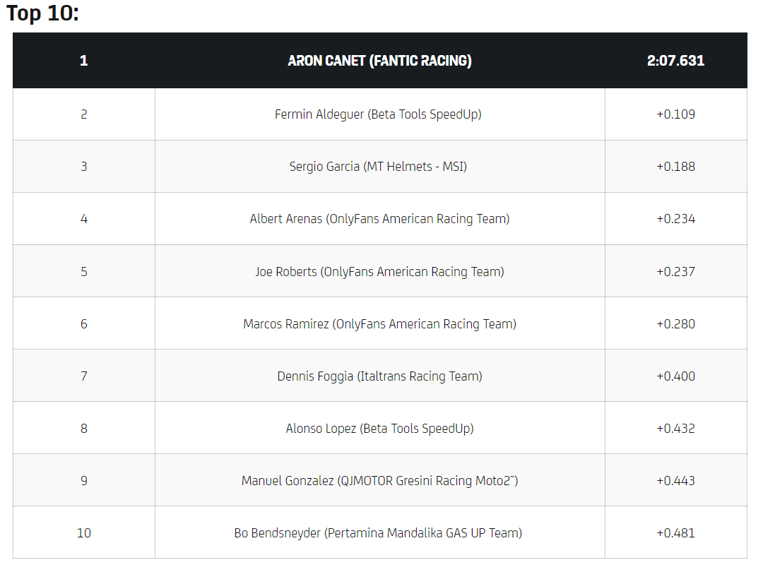Aron Canet (Fantic Racing) stole pole position in the closing moments of the qualifying – setting a fantastic 2:07.631. The Spaniard took pole position from compatriot Fermin Aldeguer (Beta Tools SpeedUp), who was a further 0.109 adrift from pole position after spending most of the session at the top of the time sheets. Sergio Garcia (MT Helmets – MSI) ended the session in third, claiming an unexpected second front-row start in the Moto2 class.