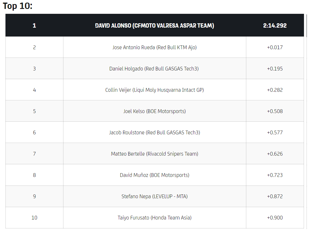 David Alonso (CFMoto Valresa Aspar Team) stole pole position on the final lap of qualifying, setting a 2:14.292 on the final lap of the session. The Colombian rounds off a perfect Saturday and will start Sunday’s race ahead of Jose Antonio Rueda (Red Bull KTM Ajo), who is a mere 0.017 behind. Rounding out a very competitive front row was the Championship leader and Red Bull GASGAS Tech3’s Daniel Holgado in third position.