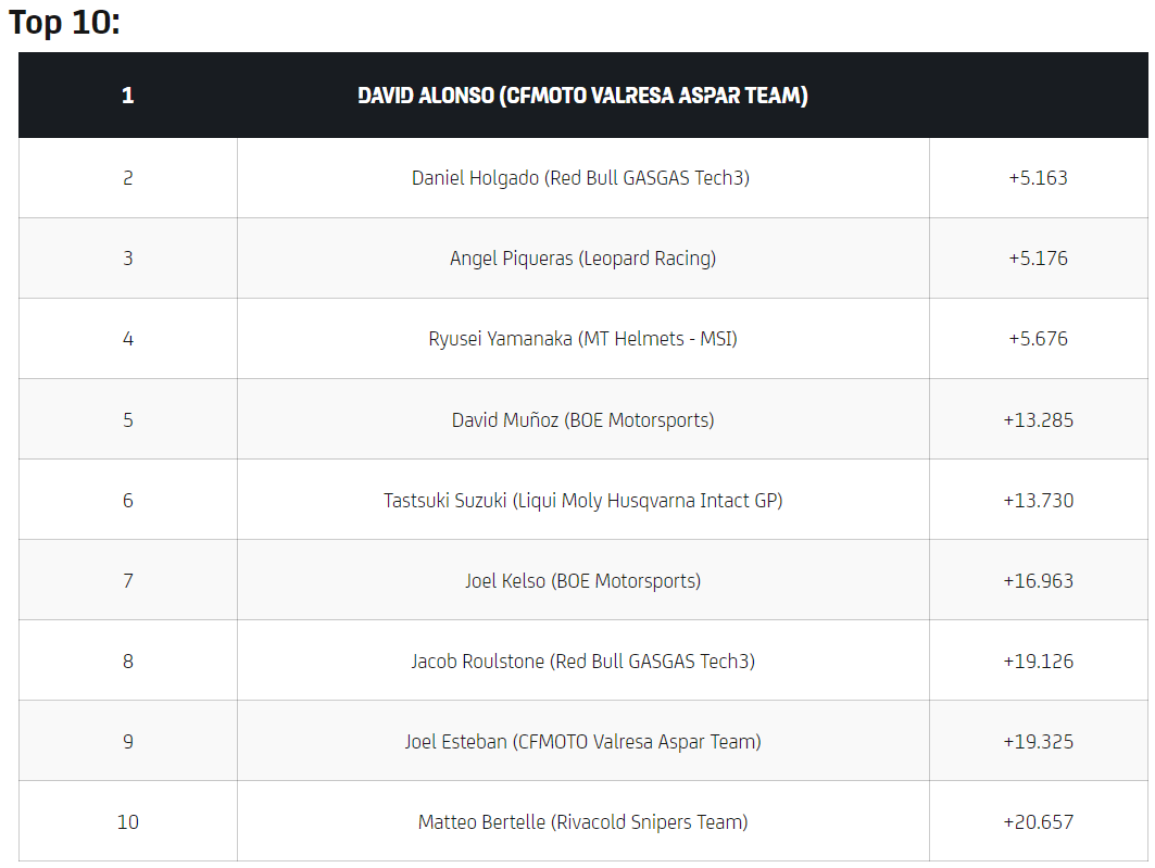 David Muñoz (BOE Motorsports) rounded out the top five after further drama at turn one, dropping to 18th on the first lap, and Liqui Moly Husqvarna Intact GP’s Tatsuki Suzuki secured the best result of his season so far in sixth, finishing the race ahead of Kelso, who also got a late LLP that became a time penalty after his incident with Holgado. Jacob Roulstone (Red Bull GASGAS Tech3) ended the race in eighth place, the rookie having another solid weekend, with fellow debutant Joel Esteban bringing the second CFMOTO Valresa Aspar Team machine to ninth. Matteo Bertelle (Rivacold Snipers Team) rounded out the top 10 after serving three LLPs during the Grand Prix, just pipped fellow 3x LLP taker Adrian Fernandez (Leopard Racing).