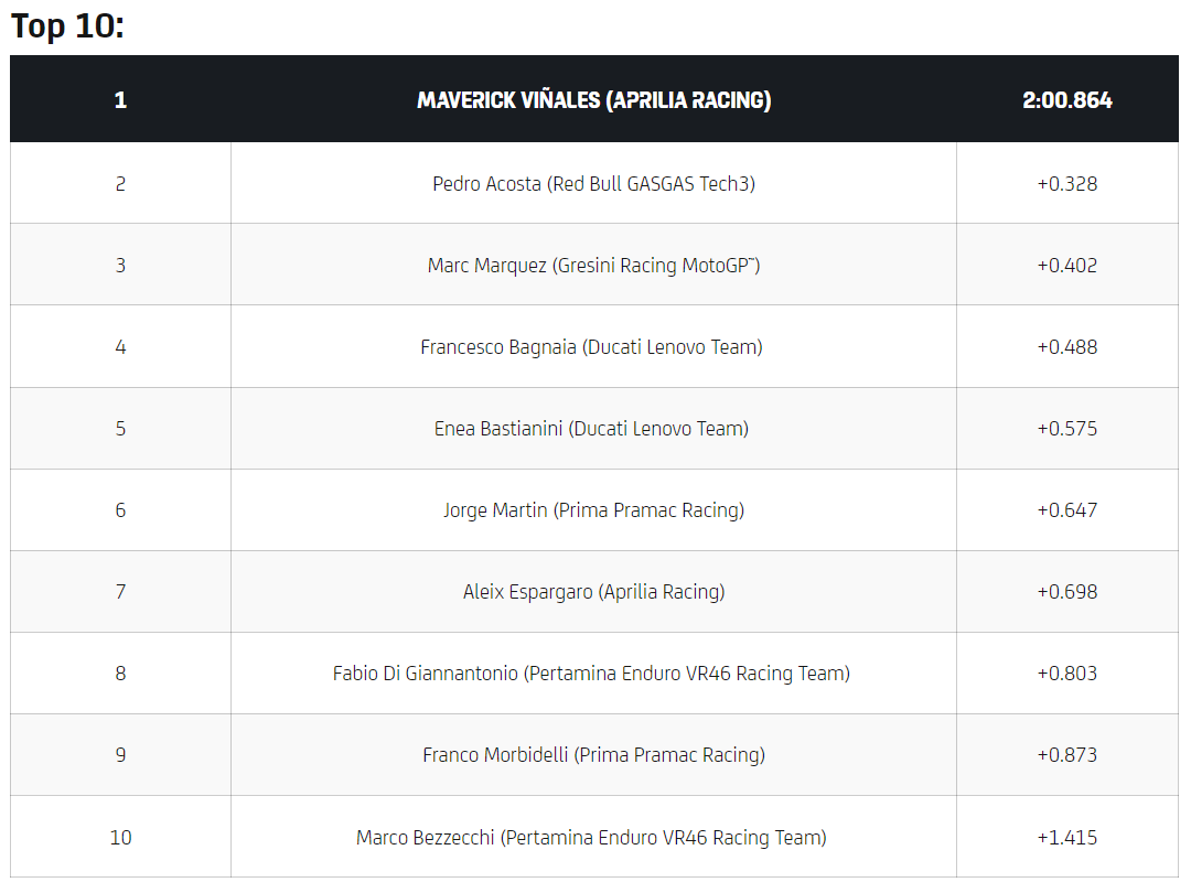 It was an exciting final five minutes with Viñales finding even more pace – setting a new lap record after setting an unbelievable 2:00.864. Acosta quickly followed into second, as the Spaniard continued to impress the paddock in the third round of the season. Martin ran wide at turn one on the final flying lap, ending any hopes of setting a time good enough to fight for pole. Further back, Aleix Espargaro (Aprilia Racing) and Marco Bezzecchi (Pertamina Enduro VR46 Racing) both suffered crashes in the first sector, taking away a chance of improvement.