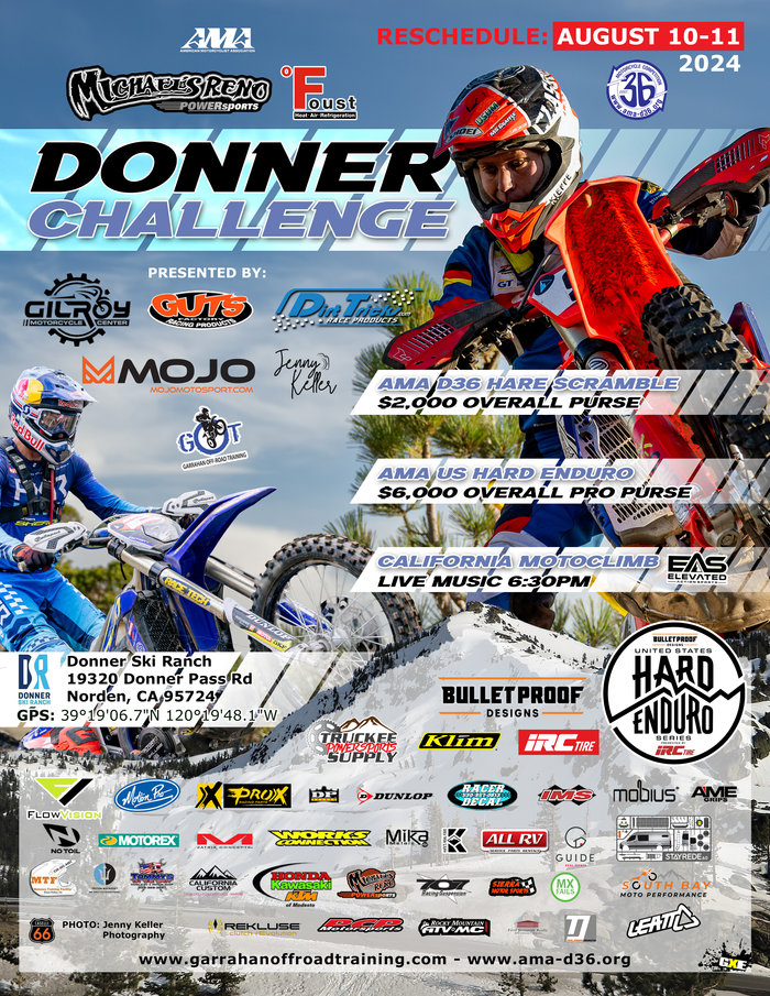 The Donner round of the U.S. Hard Enduro series is postponed from its originally scheduled date of June 15-16 to August 10-11.
