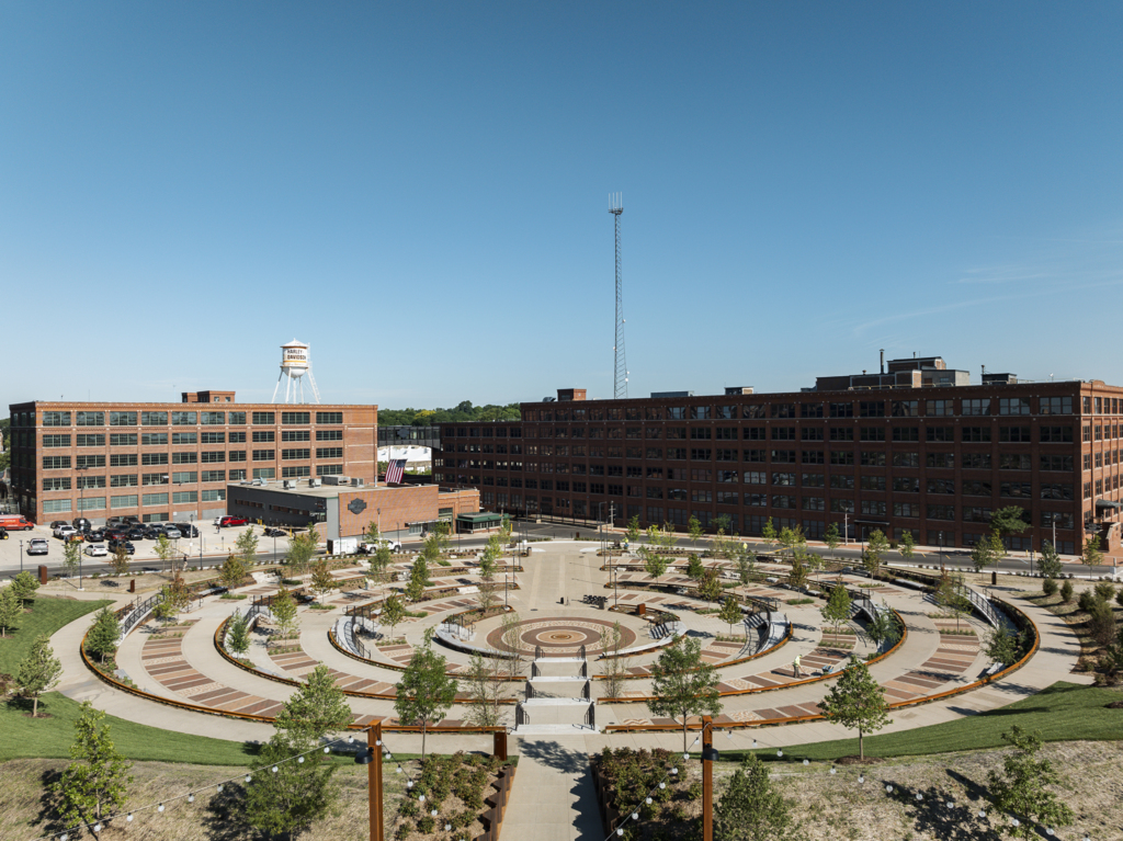 In one direction, “The Hub” will provide views of the brick buildings of the original home of Harley-Davidson. In the other, visitors will see a park sown with 120 native plant species, including 20 species of trees and 100 species of perennials, some of which are sacred to the Forest County Potawatomi tribe, who have helped provide guidance throughout the process.