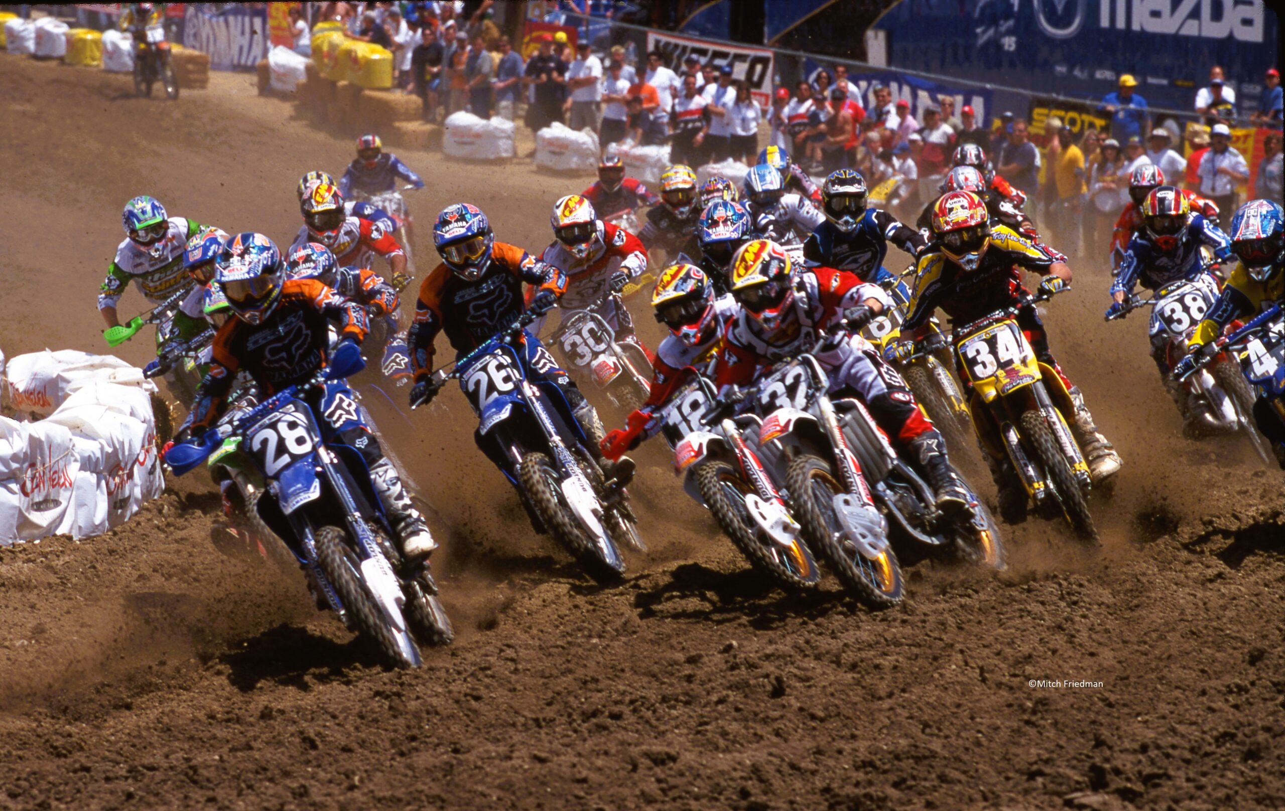 In this week’s Throwback we dial back the time machine 24 years to the year 2000. In May of that year Glen Helen Raceway opened the outdoor national season and with Ricky Carmichael moving up to the 250cc class, the 125cc class was wide open. It was anyone’s guess as to who would end the day atop the podium. This photo shows the start of one of the motos that day. Yamaha of Troy’s Ernesto Fonseca (No. 28) and Stephane Roncada (No. 26) got great starts, as did FMF Honda’s Brock Sellards (No. 18) and Danny Smith (No. 32). Also clearly visible in the Mitch Friedman photo are Casey Lytle (No. 30), Robbie Horton (No. 61), Travis Preston (No. 34), Paul Currie (No. 38) and Michael Craig (No. 43). And who stepped up post-RC? It was Frenchman Roncada scoring a 1-2 to earn the overall that day ahead of Tallon Vohland and Steve Lamson. Roncada earned the victory despite reporting that he ate too much between motos.