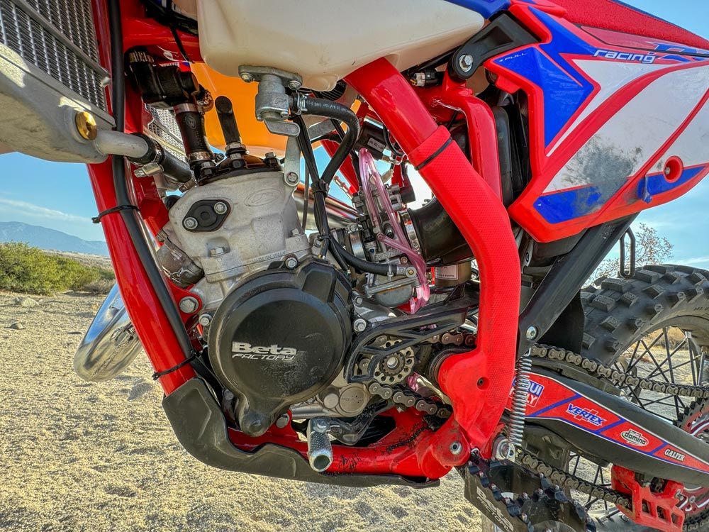 Like all Beta off-roaders, the 125 RR Race Edition is sprinkled with several off-road amenities, like wide billet machined aluminum footpegs, ZF-manufactured sprockets, a quick-release front axle pull with a red anodized alloy lever, a grippy seat cover with a built-in card holder, a quick-release seat, hand guards, a skid plate, a sturdy side stand, and a pseudo headlight/taillight combo. And they all look high quality—even the red chain guide. The transmission oil filler cap, engine oil filler cap, and oil filter cap are also anodized red aluminum. The shift lever and rear brake pedal are black anodized. Rims are black, as well. Yes, the Beta is a looker. In my opinion, there is none better than 125 RR Race Edition or Beta’s complete line of Race Edition off-road models, for that matter. A drive back from the desert with the Beta 125 RR Racing in my truck once netted two thumbs up, a honk, and a “nice 250!” from a neighborhood kid pedaling past as I entered my driveway.