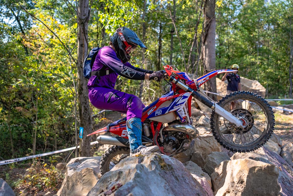 The stage was set for Sunday’s Pro race. Eight miles of track were laid out in the Ohio woods with eight additional Pro splits for added difficulty. Flynn was fastest off the start, taking the holeshot with Bolopue hot on his heels. Bolopue would push Flynn all race, getting within seven seconds of the Beta rider in lap three, but Flynn had found the flow and extended his lead throughout the rest of the six laps, finishing a full 10 minutes in front.