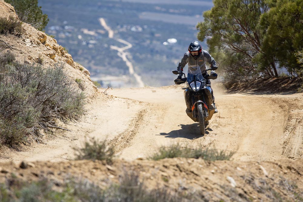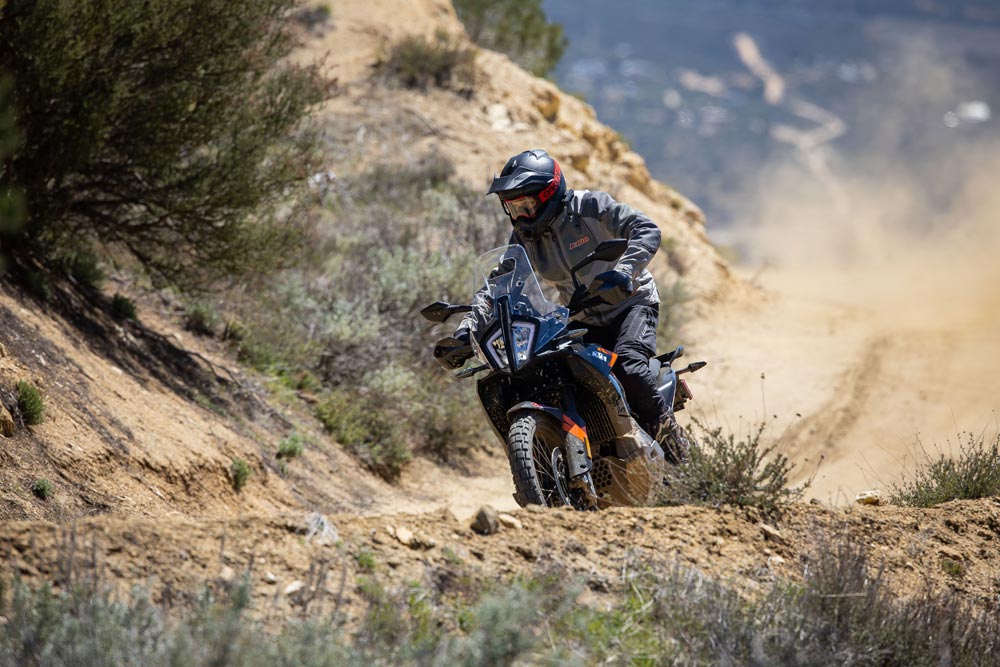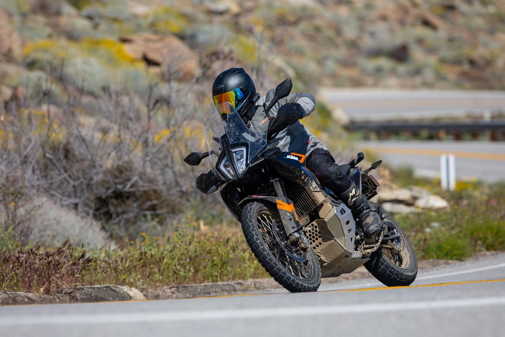 We tested our machine with the fully equipped Tech Pack installed. This $734.99 option unlocks the electronics potential of all options, including KTM’s Quickshifter+, Rally mode, and Cruise Control. We’ve mentioned this in every KTM Adventure test in the past five years—get the Tech Pack installed. You will want the quickshifter, cruise control and fantastically functional rally mode with on-demand variable rear wheel slip control. It’s easy to use and works wonderfully. All electronic options are accessed through and displayed on a fantastic five-inch TFT display that is easily read in all lighting conditions. Switchgear to manipulate options on the clutch side is a familiar and effective cluster, void of complicated rotating wheels or other distractions.