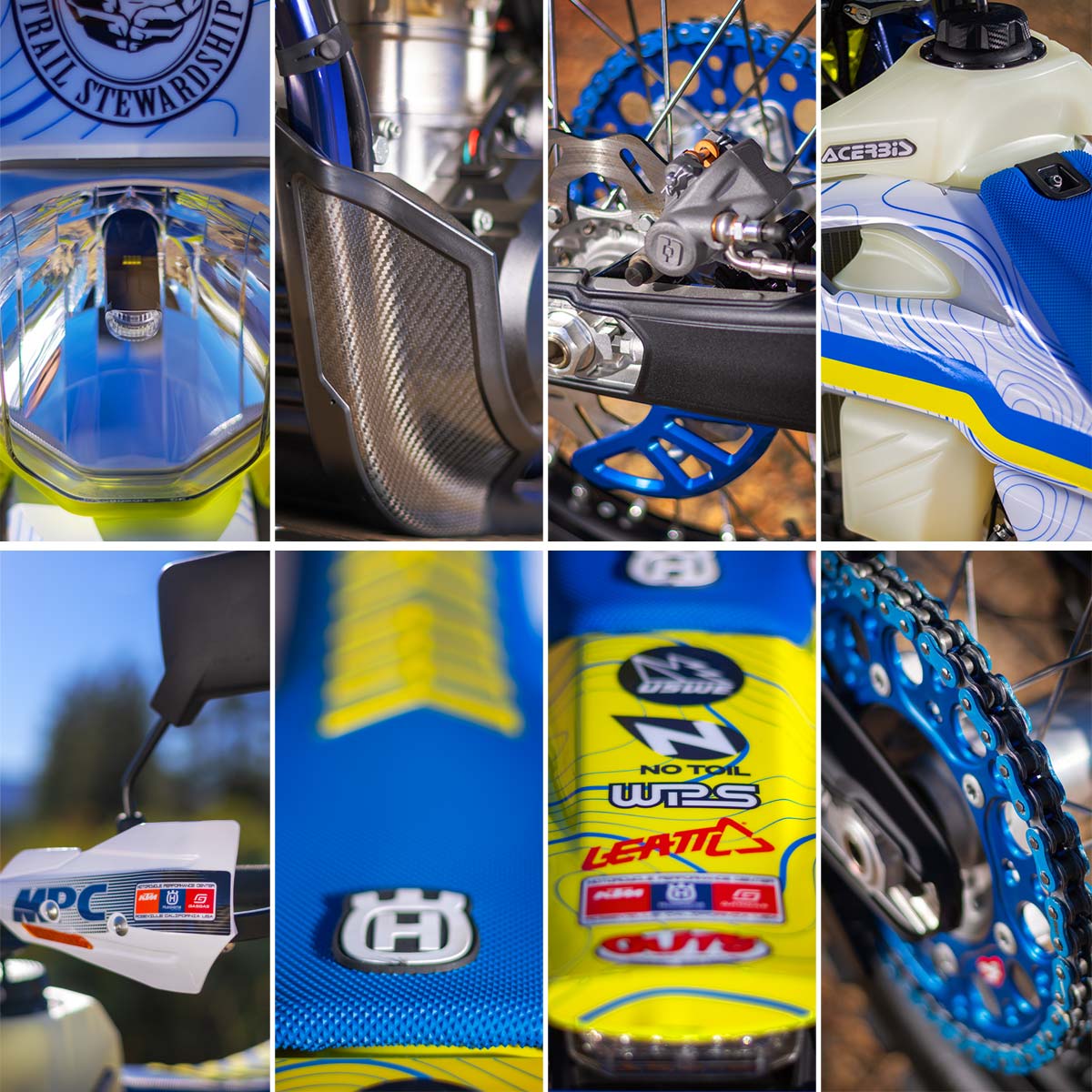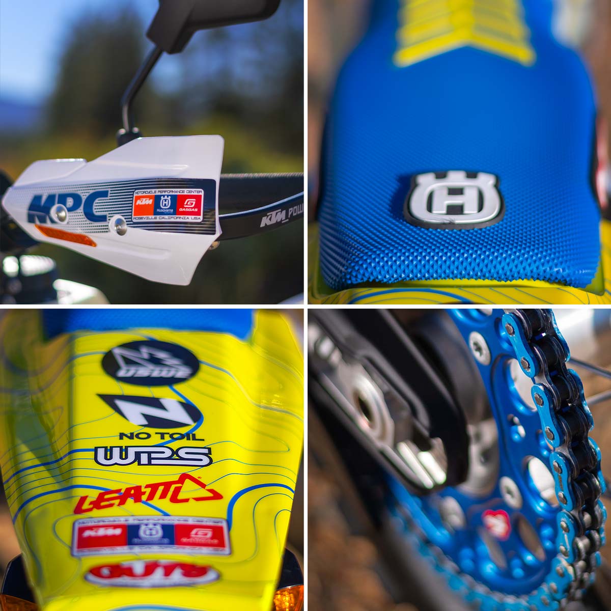 The mid-size Husqvarna is one of the most versatile dual-sport machines on the market, and we we added a little extra flare to it, thanks to Motorcycle Performance Center/Husqvarna of Roseville, including upgrades to an Acerbis 12-liter fuel tank, No Toil Air Filters and filter kit, Custom Guts Racing graphics and Guts Racing Dual Sport Complete seat, which will be fresh off the production line as seat No.1 of the model just starting to hit the market. The Factory blue rear disc guard, swing arm guards, Factory skid plate, handguards with LED turn signals and Factory Renthal sprocket and chain kit tie the whole aesthetic together. MPC donated the Acerbis tank and all the labor to get the bike dialed, as well as gave us a great discount on the bike so we could put more dollars into the trails.