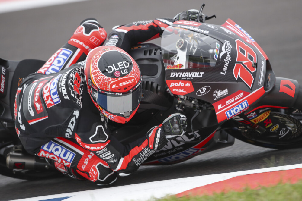 Ominous raindrops in the air ahead of qualifying made it a tense session but Bertelle got the job done by a stunning margin of 0.462 to head through. He was joined by Marcos Uriarte (GRYD – MLav Racing), Taiyo Furusato (Honda Team Asia) and Adrian Cruces (CIP Green Power), with one surprise being Luca Lunetta (SIC58 Squadra Corse) as the Italian didn’t make the cut. He gave it a good go though, and on his final fast lap in worsening conditions pulled of a bucking bronco of a save – just losing the chance to move up the order and through to Q2.