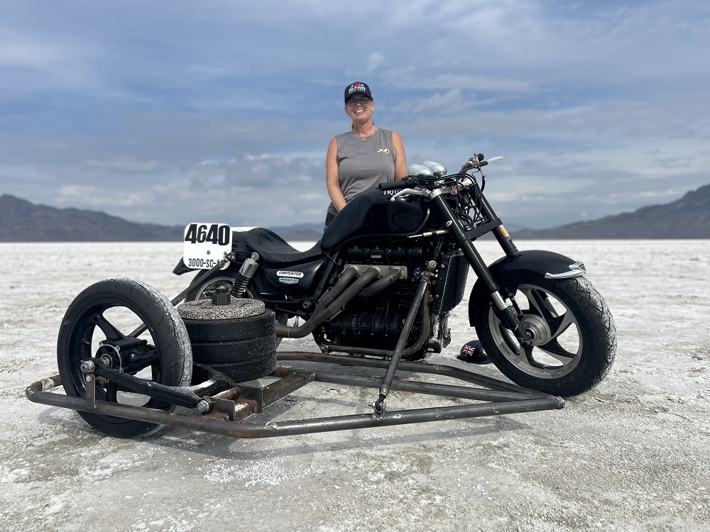 Riders are measured over both a timed mile and a timed kilometer and after their initial down run they have two hours to complete a return run with the times combined and an average calculated to determine the official speed and Langlois piloted her unfaired, three-cylinder 2012 JKR Powersports 2295cc Triumph Rocket 111 Roadster with weighted sidecar to an FIM World Record of 136.331 mph (219.404km/h) over the timed kilometer.