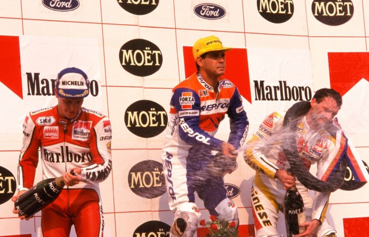 In this week’s Throwback we dial back the calendar 35 years and view the podium for the 250 Grand Prix class of the 1990 Czechoslovakian Grand Prix. Carlos Cardus stands triumphant atop the 250cc podium spraying champagne after a hard-fought victory on his Repsol Honda. Flanking him are American John Kocinski (left), who was runner up riding for Marlboro-Yamaha Roberts, and Germany’s Helmut Bradl who took third. Cardus and Kocinski, fierce rivals all season, battled relentlessly for the 250GP title, with Kocinski ultimately clinching the championship.