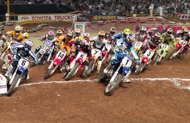 In this week’s Throwback we dial back the clock to January of 1999 and that year’s third round of the AMA Supercross Series held at Bank One Park in Phoenix. This image shows the start of the main event with Mazda/Chaparral Yamaha’s Jeremy McGrath (1) earning the holeshot, just edging out factory Yamaha’s John Dowd (6). Also coming in hot are Honda riders Kevin Windham (14) and Mickael Pichon (5) followed by Suzuki’s Larry Ward (7). Also shown in the photo are David Vuillemin (934), Robbie Reynard (17), Mike LaRocco (3), Jeff Emig (11) and Sebastien Tortelli (44).