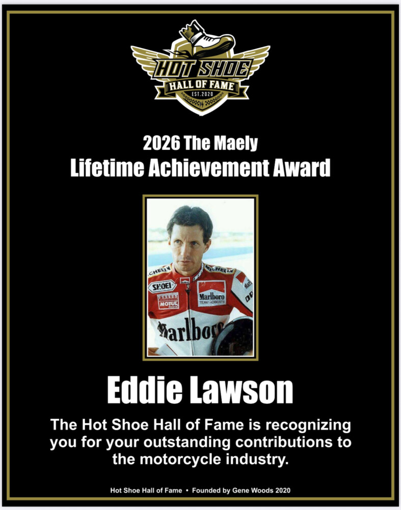Four-time World MotoGP Champion Eddie Lawson has been named the recipient of 2026 Maely Lifetime Achievement Award and will be honored on Saturday, January 31, at the sixth annual “Hot Shoe” Hall of Fame Museum and Motorcycle Industry Celebration at the Las Vegas’ Notoriety Theatre in the famed Las Vegas Fremont Street Experience (450 E. Fremont St., 3rd Floor).