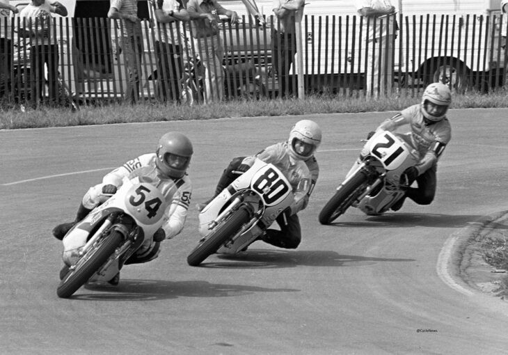 In this week’s Throwback we dial back the clock to September of 1973 and arrive at Charlotte Motor Speedway, which was hosting an AMA Road Race National. This photo shows the Expert/Junior Combined (250GP) race. That’s Junior class rider Peter Chancy (54) from Canada about to get passed by Experts Kenny Roberts (80) and Gary Fisher (21). Roberts went on to win the race over Yvon DuHamel and Fisher, while Chancey scored the victory in the Junior class.