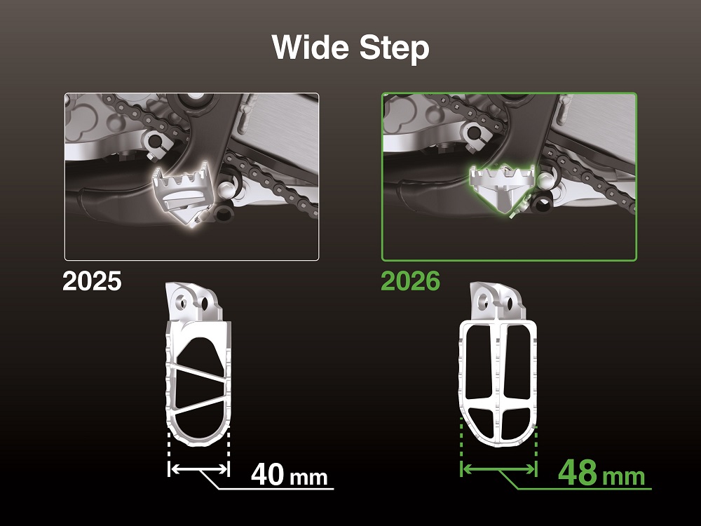 Further enhancing rider stability, the footpegs have been redesigned with several meaningful improvements. The peg width has increased from 40mm to 48mm, offering a larger platform with more teeth for better boot grip and enhanced overall control. The wider construction also improves mud-shedding performance, maintaining traction in challenging conditions. Additionally, the footpegs no longer feature the previous forward-canted angle; instead, they now sit in a flat orientation.