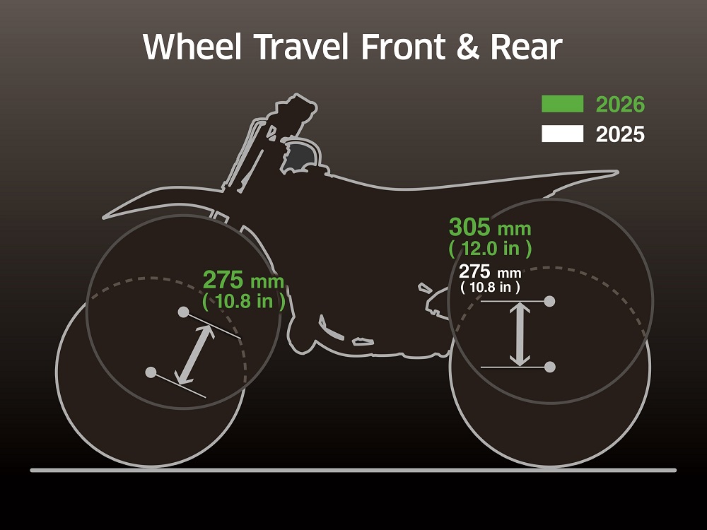Several new styling elements further elevate the bike’s race-ready presence. The front end features a sharper, shorter fender with a curved profile that follows the contour of the tire, creating a visually cohesive front-to-rear flow that makes the fender appear as though it wraps around the wheel. A new, more compact number plate pairs seamlessly with the redesigned fender, contributing to a clean, modern look that mirrors the styling of Kawasaki’s top-level motocross machines. Revised fork guards – shaped after those on the KX250 and KX450 – wrap partially around the new, larger-diameter fork tubes, adding both functional protection and a distinctly premium appearance.