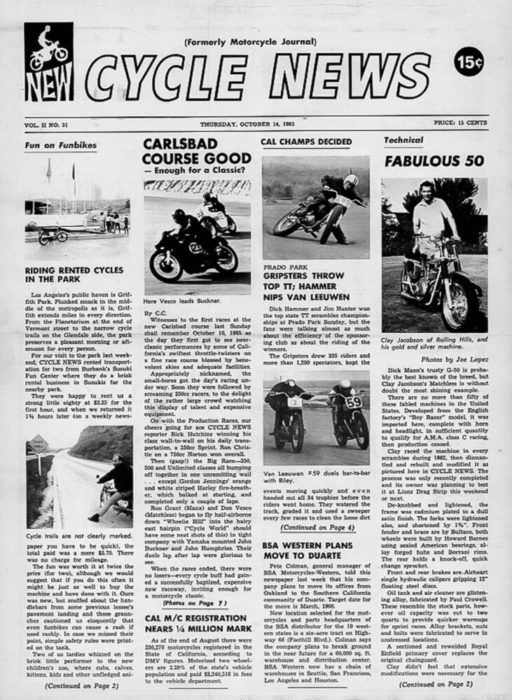 The first issue with the name of Cycle News, which, for those of you who were born after 2010 that might not know, was a weekly print newspaper mailed every Tuesday morning that would get black ink on your fingertips as you read it and featured several small photos and news items on the front page. Some of the names in the news in that issue were Don Vesco, Dick Hammer, Skip Van Leeuwen and Dick Mann, and the Claytons lived up to their 12-page promise.