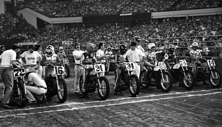 In this week’s Throwback Thursday, we dial it back 50 years to the Bicentennial year of 1976 and the opening weekend of that year’s AMA Grand National Championship inside the Houston Astrodome. This photo shows riders lined up, ready to start the Short Track main. From left to right you see Mike Kidd (72), Ken Hapke (16P), Bubba Rush (24), Darryl Hurst (34), Billy Labrie (65), Bruce Hanlon (78Z) and Hank Scott (14) on the front row. On the second row you can just see Dave Hansen (23). Rush took the lead on his Bultaco in the closing laps after previous leader Kenny Roberts retired with bike problems. Rush was from Houston and the Astrodome fans loved seeing one of their local heroes taking the victory. It proved to be the only national Rush would win during his racing career.