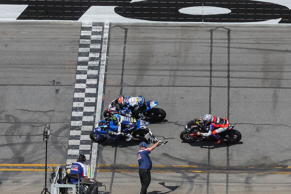 Yamaha BLU CRU Estenson Racing’s Sam Drane took the win in a photo finish during an abbreviated Twins Cup Race 2 at Daytona. The race was halted on lap one after a crash in the infield brought out a red flag making it a six-lap sprint to the finish.