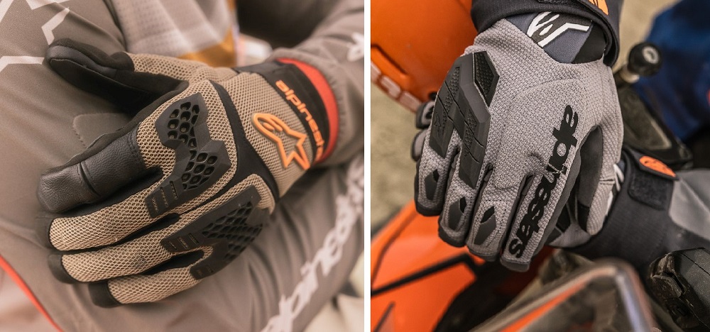 Alpinestars Durack Gloves: Lightweight summer adventure gloves optimized for dual-sport riding. The Durack Gloves feature a spandex backhand for flexibility and a customized fit, a synthetic suede palm for durability, a divided knuckle design with direct-injection TPR on the lateral knuckles, and 5mm padding over the medial knuckles.