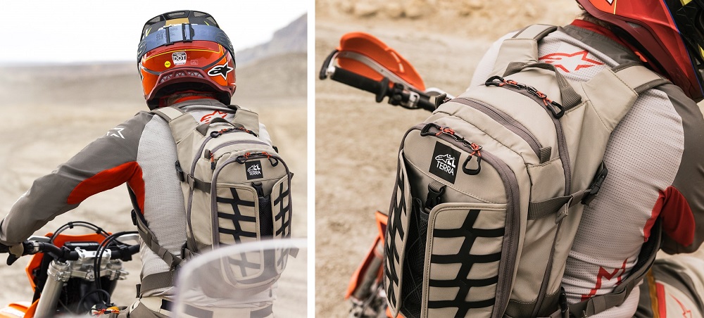 Alpinestars All Terra AT-15 Backpack: Designed for extreme adventure riding, the AT-15 Backpack features innovative expandable, multi-functional storage and a 900D rugged construction. Built with rider ergonomics and comfort in mind, the backpack has a customizable, multi-adjustable strap Comfort Fit System with a central magnetic chest lock that allows for fine-tuning of the fit for enhanced stability during intense riding. The chest straps also feature stowable mesh map pockets. A MOLLE compatible-panel with multiple attachment loops provides modular carrying and mounting options for radios and other riding essentials. A convenient packable rain cover is included. The price for the backpack is currently listed at $269.95.